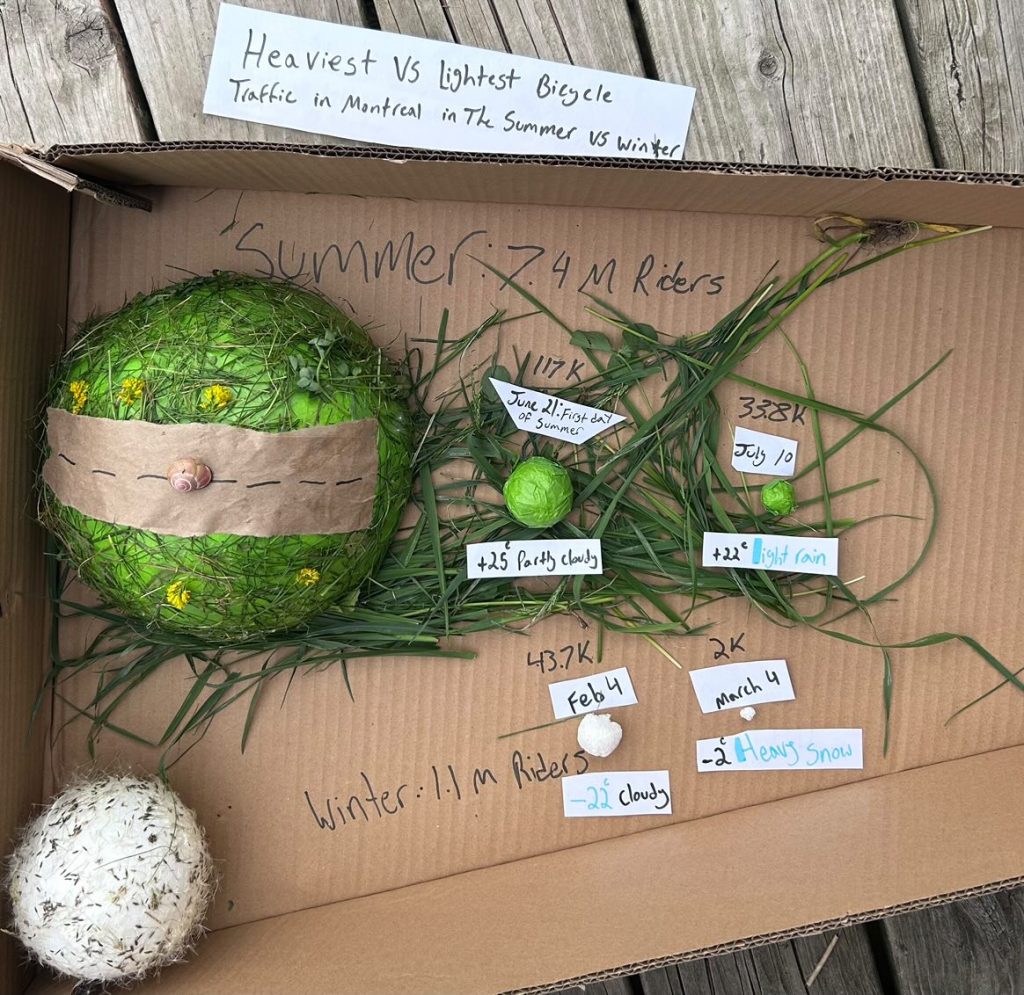 Median: Big Styrofoam balls were used to represent the sum of all sensors triggered by cyclists during the summer and winter of 2023. One is covered with grass to represent summer and the other is covered with dandelion fluff to represent snow. Smaller pieces of Styrofoam balls (or just bits of it) represents the highest and lowest days of traffic in Montreal with respect to the season it’s from. It is placed in a box diorama with the date for the smaller Styrofoam and the number of sensors triggered for everything in it. The weather for these days is also included.