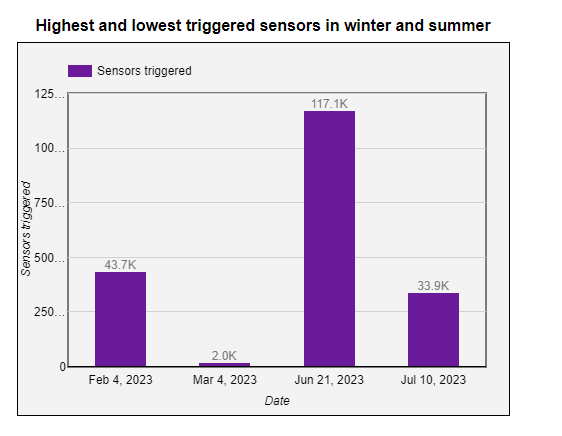 Description: We have selected to work on bikers in Montreal and try to compare the bicycle traffic in winter compared to summer. We noticed there was a clear difference in the number of biker traffic between the seasons, which shouldn’t come as a surprise. The bar graph displays the highest and lowest points of bicycle traffic with the left 2 representing winter and the right 2 representing summer. During the winter, the lowest was approximately 2k on March 4th (-2 Celsius and heavy snow) and the highest was 43.7k on February 4th (-22 Celsius and partly cloudy). During the summer, the lowest was 33.9k on July 10th (22 Celsius and light rain) and the highest was 117.1k on June 21st (25 Celsius and partly cloudy). We believe the weather plays a role in the amount of traffic, not just temperature. For example, although it was -2 on March 4th, the heavy snow was likely a huge factor as to why there was low traffic. During the summer, rain could be a factor as well. Another thing to add is that it made sense as to why June 21st was the busiest day during the summer as it was the start of the summer solstice. The favourable conditions on this day is another reason why it had the highest bicycle traffic during the summer.