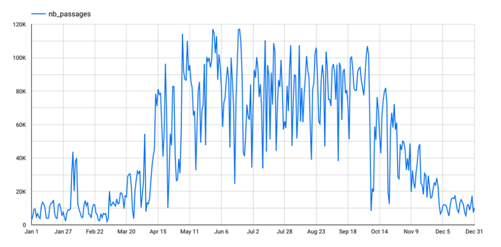 The graph above represents the number of bike riders that are using the bike paths for each day in 2023 in the city of Montreal. A piece of data that stands out in this graph is that in winter from December to March there are not as many biker riders as compared to the summer, spring, and fall from April to October. If we analyze the graph in winter, there is roughly less than 10,000 bike riders per day. On the other hand, if we look at the months in summer the data goes to a high of 115,000 bike riders in one day and can reach a low of 50,000 bike riders in one day. The day that had to the greatest number of bike riders in 2023 is May 30 with 117,140 individuals using the bike paths around Montreal. The day that had the least number of individuals using the bike paths was March 4 with 2,021 bikers. Factors such as temperature play a role in affect the number of bike riders in the winter. In winter it is usually cool so most individuals will not want to use the bikes for transportation. In the summer the temperature is a lot warmer so most people living in Montreal will want to enjoy the nice whether and take the bike for transportation. Another factor is the condition of the roads in winter it takes a lot more effort to ride a bike thought the snow as in summer the condition of the roads is clear and a lot easier for rider to ride their bikes.